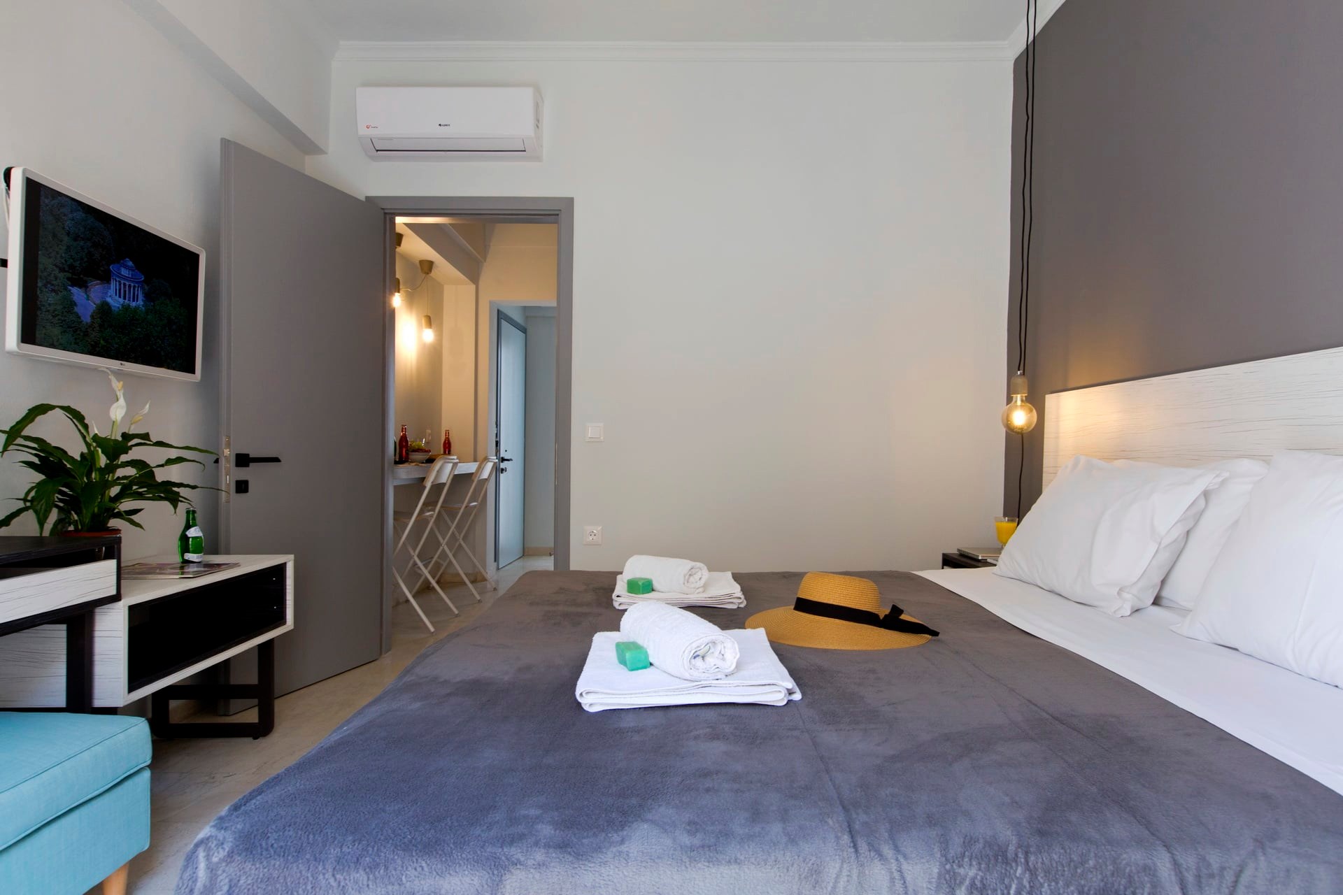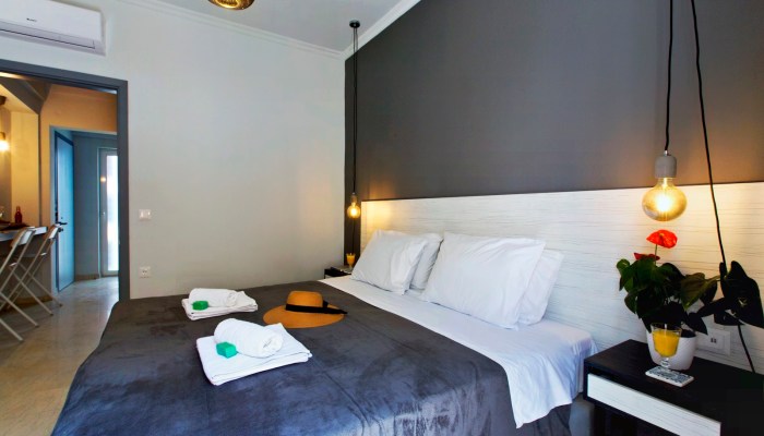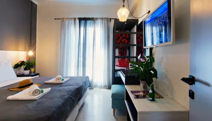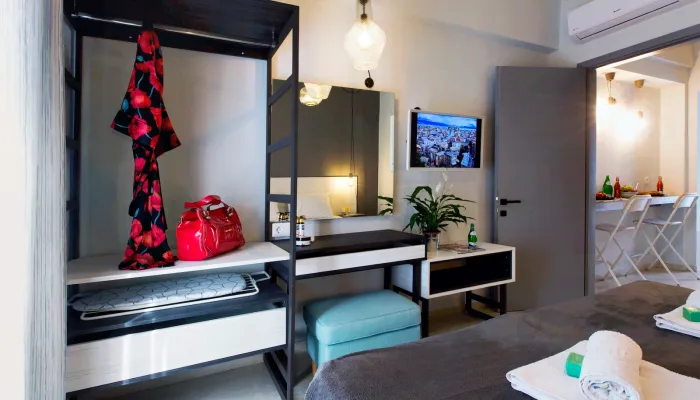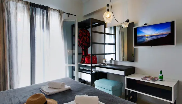 - Main area: Υπνοδωμάτιο με king-size κρεβάτι (ή δύο μονά), τηλεόραση επίπεδης οθόνης με Netflix, μοντέρνα ανοιχτή ντουλάπα και μπουντουάρ που μπορεί να χρησιμοποιηθεί και ως γραφείο εργασίας.
