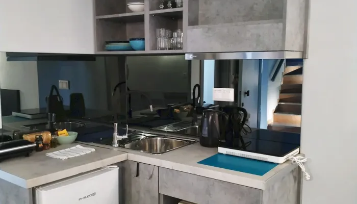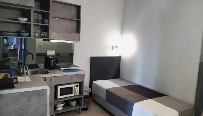 - Kitchen area: Πλήρως εξοπλισμένη κουζίνα με φούρνο μικροκυμάτων, εστία, βραστήρα, καφετιέρα και όλα τα απαραίτητα σκεύη για την προετοιμασία και απόλαυση γευμάτων. Σε αυτόν τον χώρο βρίσκεται ένα μονό κρεβάτι, ενώ μπορεί να προστεθεί βρεφική κούνια κατόπιν αιτήματος.
